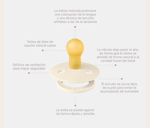 La tetina incluye una válvula de ventilación que elimina el aire cuando el bebé cierra su boca aplanando la tetina para adoptar la forma natural de la boca del bebé. Está hecha de látex de caucho 100% natural suave y flexible (El caucho es un material natural por lo que pueden ocurrir variaciones de color).