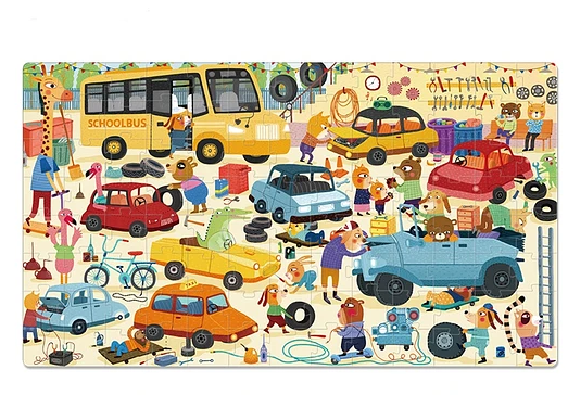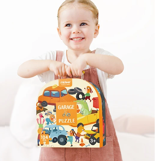 Puzzle de 104 piezas en maleta, ideal para guardar y transportar fácilmente, diseño mi garage, esta compuesto por el diseño diferentes animales, herramientas y vehículos que pueden ir a un garage.
