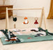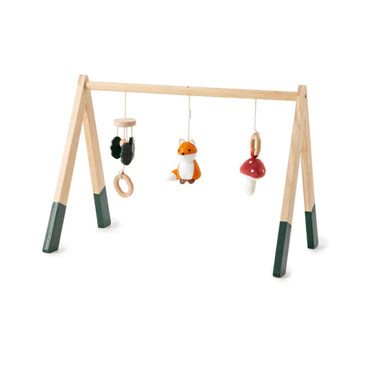 Contiene un animal, un elemento vegetal textil que cruje y un móvil de madera.
