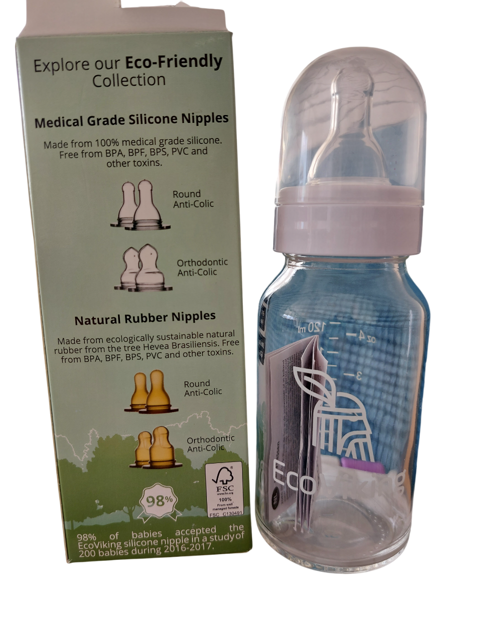 Mamadera de vidrio ecológica Anticólicos, marca sueca EcoViking.