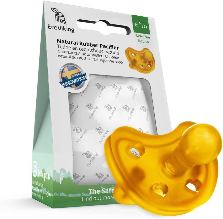 El chupete de caucho natural EcoViking está hecho de caucho 100% natural y no solo es ecológico y biodegradable, sino que también le da al bebé una sensación más suave. La forma del chupete sigue la cara del bebé y no cubre sus naricitas. Los chupetes de caucho natural EcoViking vienen en tres tamaños diferentes, tanto redondos como ortodóncicos. El chupete de caucho natural está hecho en un diseño llamado de una sola pieza, lo que significa que está moldeado en una forma. Eso hace que sean más fáciles de limpiar en comparación con otros chupetes y evita que se acumulen bacterias. Puede limpiar su chupete de caucho natural a mano o ponerlo en agua hirviendo durante 5 minutos.